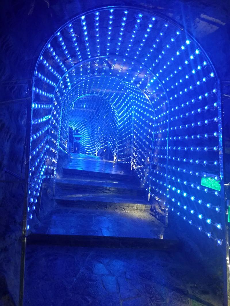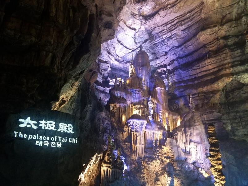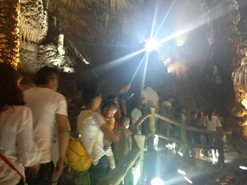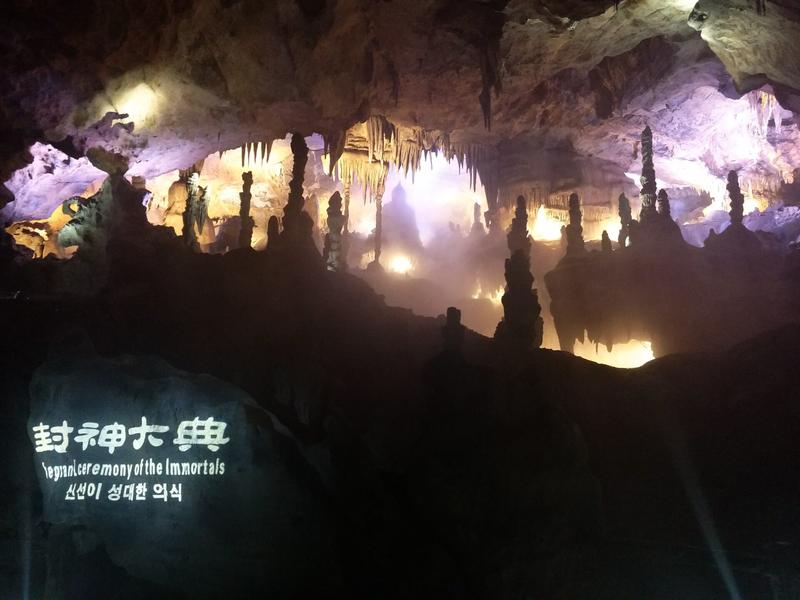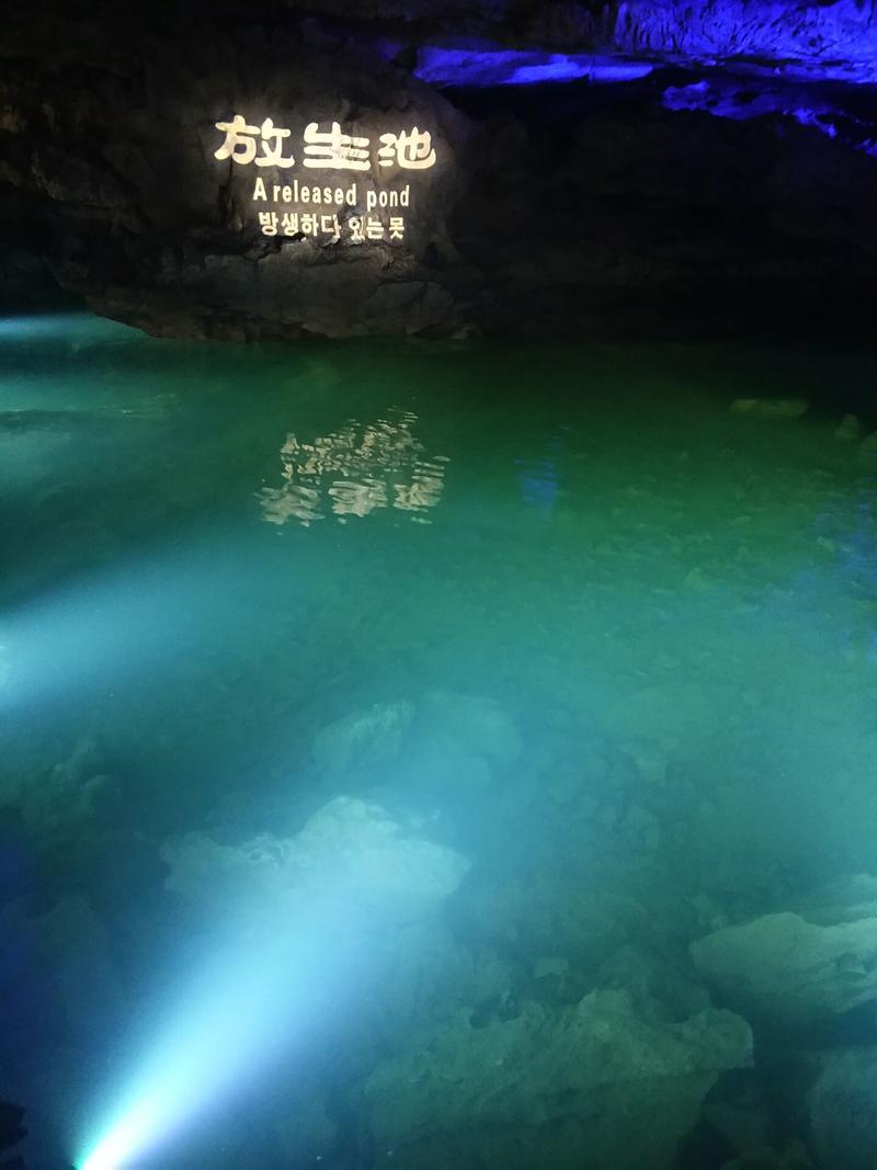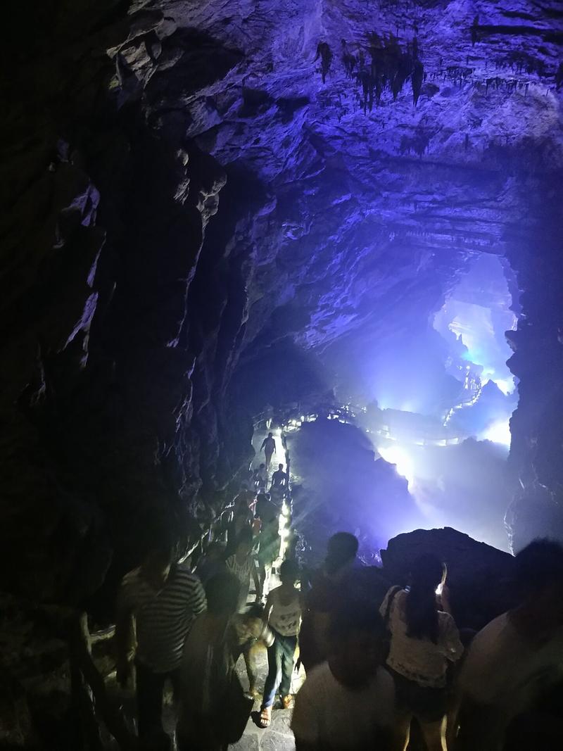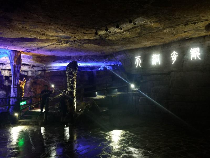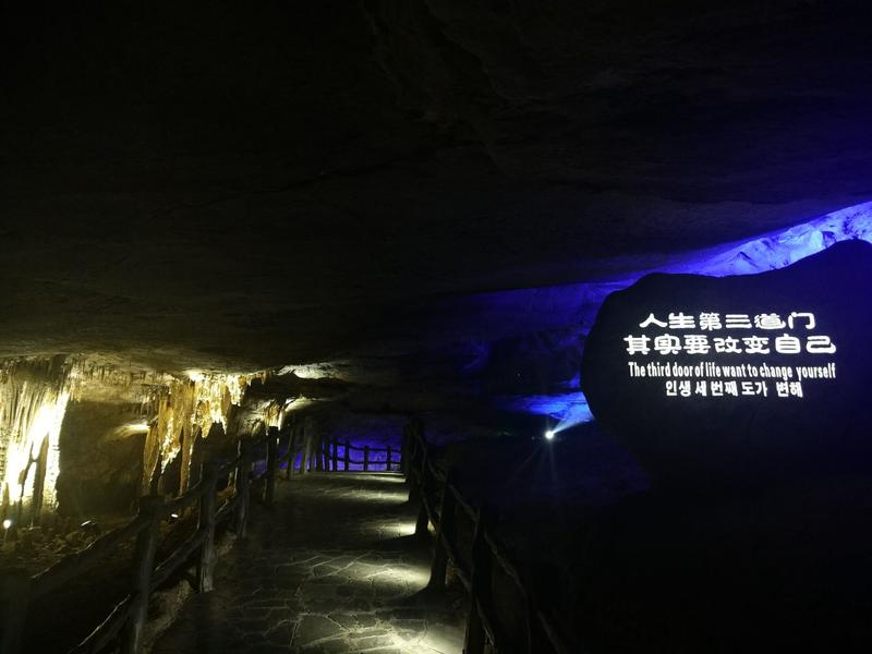 这个“天洞”今后还将开发1公里多的水上景观。在抗日战争时期,这个洞曾经是当地群众的“避难所”。大家在里面生活两个多月,可以摆摊做各种买卖。洞内的钟乳石千姿百态,有高达30多米的石柱、有的溶岩石像如来佛祖、有的又像十八罗汉,也有倾泻而下的瀑布和碧绿色的天池等等。在50万盏灯的七色光照射下,2.8公里的洞内景观美仑美奂,像在天堂幻境一般。